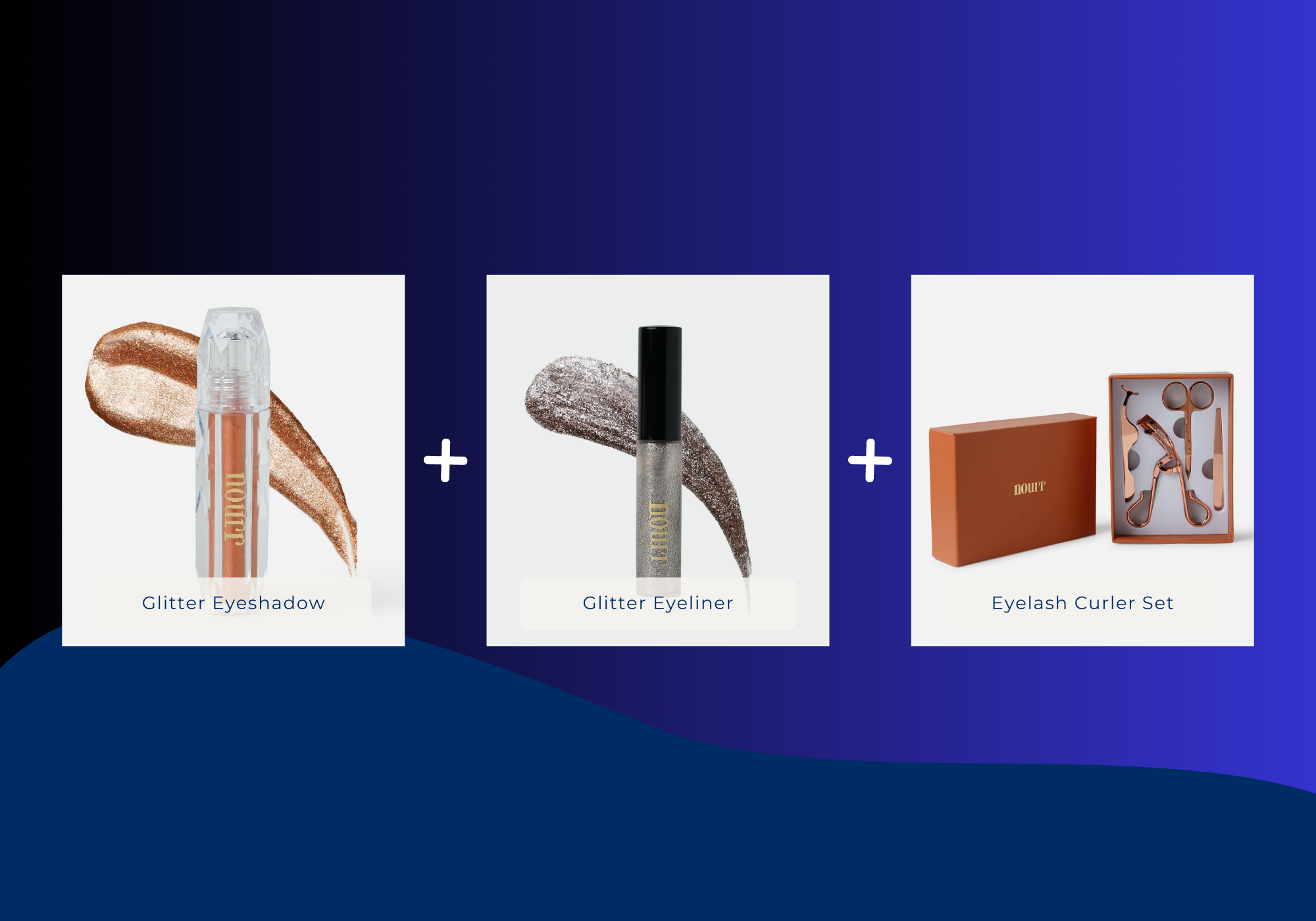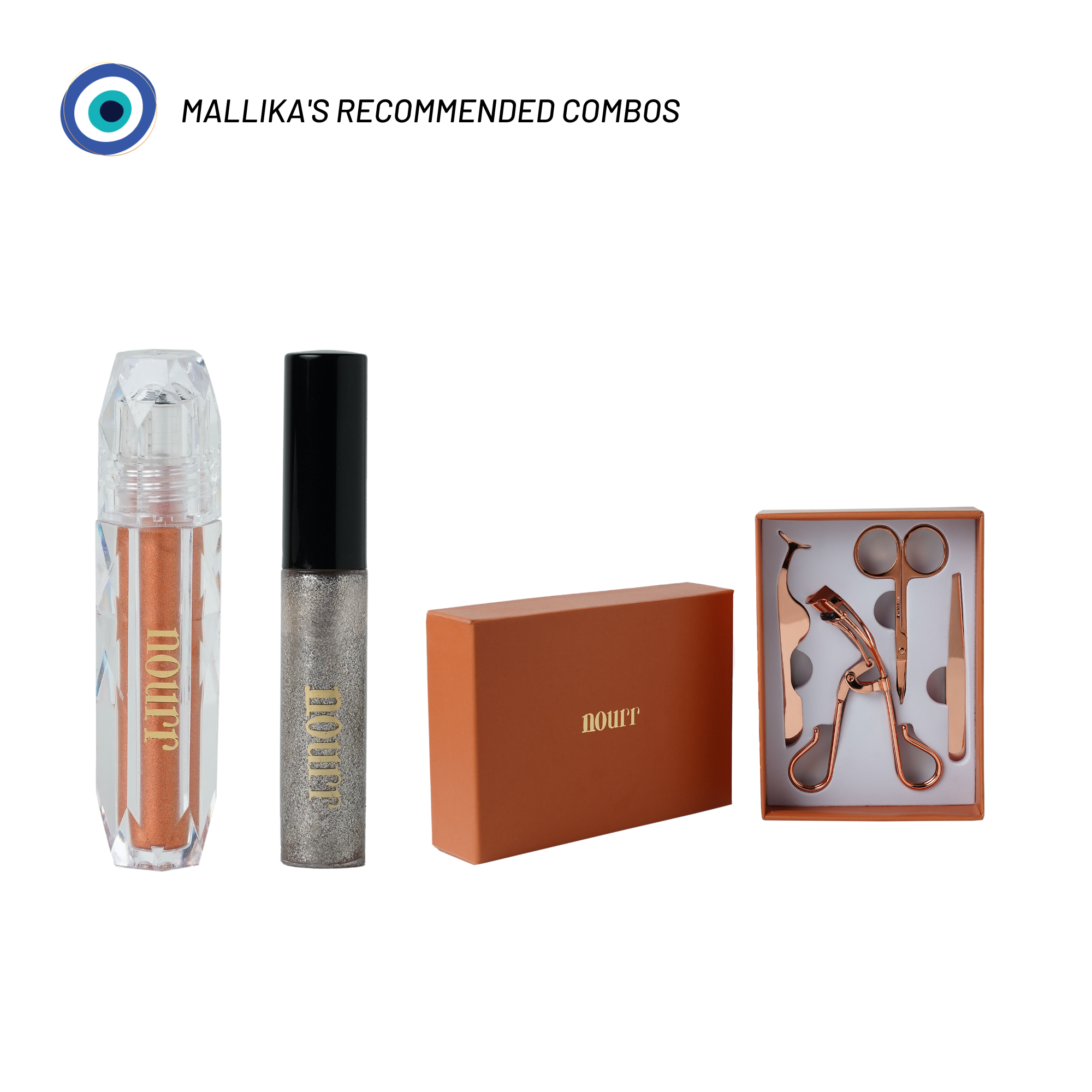 Nourr's Glitter Eyeshadow, Eyeliner and Eyelash Curler Set Bundle